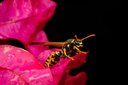 Macro shot of a wasp perched on a vivid pink flower. Strong contrast between subject and dark background highlights insect details, texture, and natural interaction in wildlife