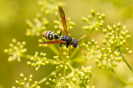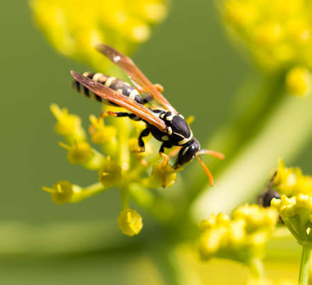 Wasp on yellow flower in nature. macro