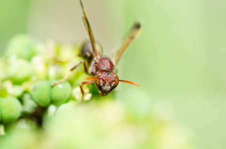 Red paper wasp (polistes dorsalis) (Hymenoptera: Vespidae), close up macro picture front view showing head detail, wings up, on Hercules club blooms (Zanthoxylum clava-herculis)