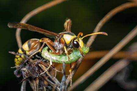 Image of paper wasp was eating the worm victim. on a natural