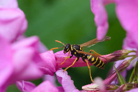 A stunning closeup of a wasp diligently pollinating a vibrant pink flower, showcasing the splendor of nature