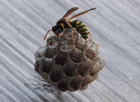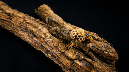 Wasp nest with wasps sitting on it. Wasps polist. The nest of a family of wasps which is taken a close-up.