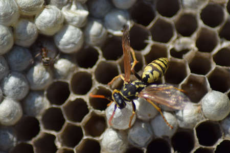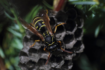 European Polistes galicus wasp hornet taking care of his nest and larvae