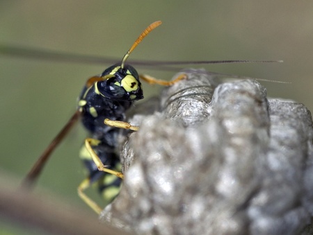 Female wiorker Polistes nympha wasp protecting his nest from attack