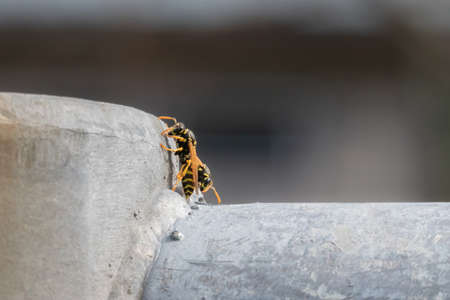 The European wasp builds a nest to create a new colony. Aspen nest of a paper wasp. Wild paper wasp building a nest next to a man, vertical frame