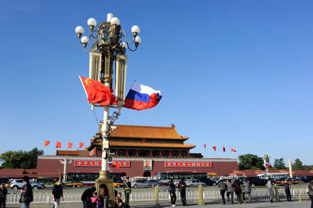 Tiananmen square, flying national flag of Russia and China