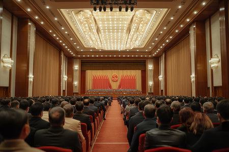 A room packed with people sitting in chairs attending the National Committee of the China political meeting.