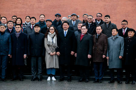 MOSCOW, RUSSIA - DECEMBER 04, 2019: Prime Minister of Mongolia Ukhnaagiin Khurelsukh with Soldiers of the Honor Guard laid a wreath at the Tomb of the Unknown Soldier near the Kremlin Wall