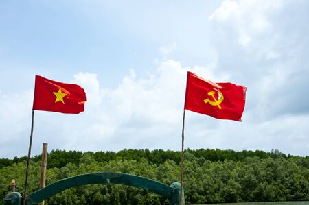 Vietnamese and communist flags in the wind on a blue sky
