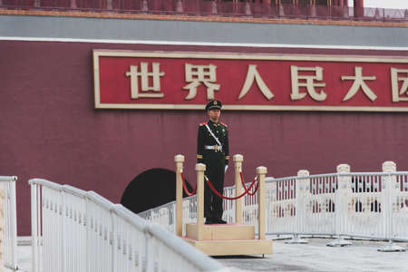 Beijing, China, October 13, 2013 A soldier stands guard in front of Forbidden City in Beijing with a portrait of Mao Zedong