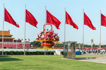 Beijing / China - September 27, 2014: Red banners unfurled in the wind at Tiananmen square ahead of the National Day celebration (65th Anniversary of the Founding of the People's Republic of China).