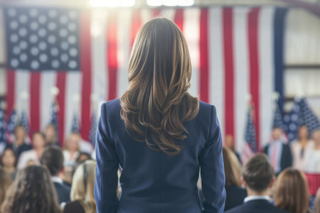 Election candidate speaking passionately to an engaged audience, with the stars and stripes prominently displayed in the background