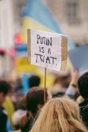 Downing Street, London | UK - 2022.03.12: Ukrainian people protest, thousands gather to demand tougher sanctions on Russia from British Government, EU and USA to stop the war in Ukraine