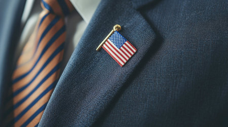 Patriotic American Flag Pin on Formal Suit. Concept of National Pride, Independence Day Celebration, Business Attire, Symbolic Patriotism. American Memorial Day, Independence Day.