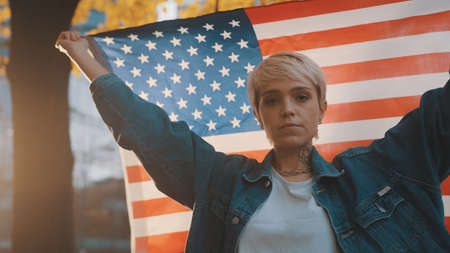 Portrait shot of young blond woman holding usa flag in the park. Election and rights of voting concept. High quality photo