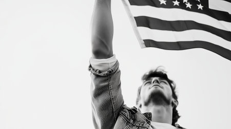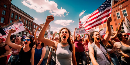 A diverse group of protesters passionately holds up their fists in solidarity, proudly waving American flags in the background, advocating for social justice and equality for all.