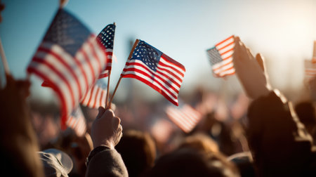 crowd of people waving multiple American flags in a patriotic gathering. Sunlight filters through, enhancing the sense of national pride. Perfect for themes on unity, patriotism, and American spirit.