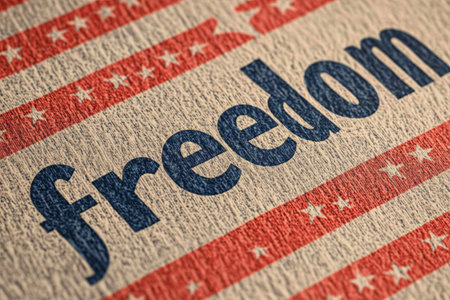 A clipboard with the words Freedom and Prosperity sits next to a small American flag and an old camera on a wooden surface.