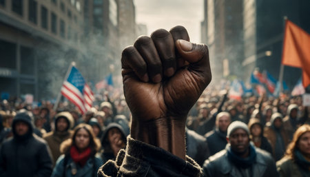 Protesters stand united with raised fists and American flags during a demonstration advocating for social justice and human rights in the United States, showcasing solidarity and determination.