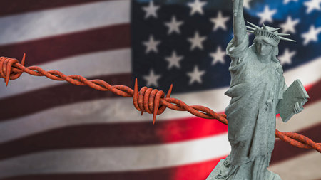 Statue of liberty and barbed wire on America flag 3d Rendering.