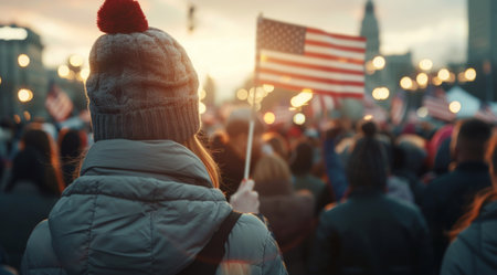 American protester listening to speech, american flag. Human rights. Activism concept.