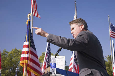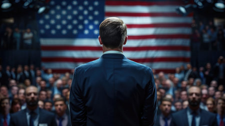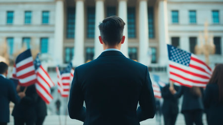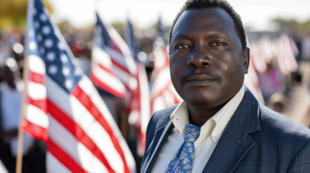 Confident Man in Suit at Patriotic Event with American Flags in Background