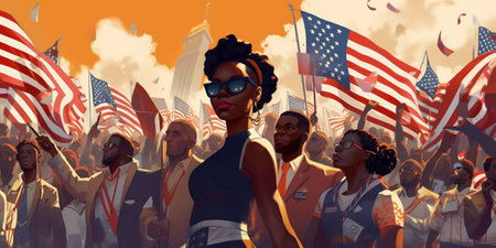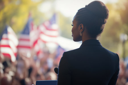 Black Female Public Speaker Inspiring Crowd with US Flags in Background
