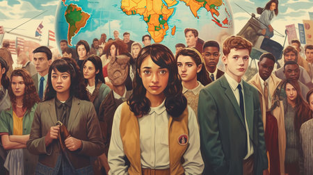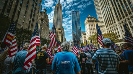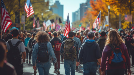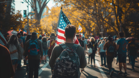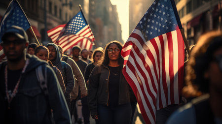 People protesting with USA flags. Group of diverse young people walking in New York City, wearing casual clothing.