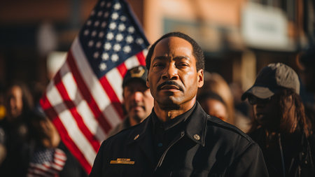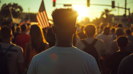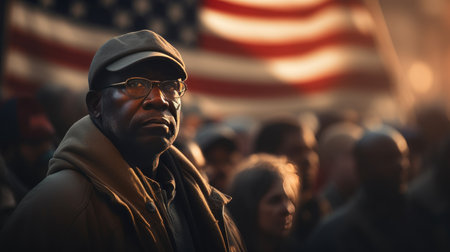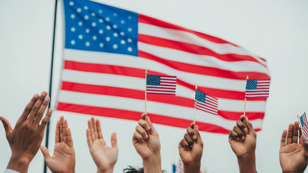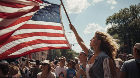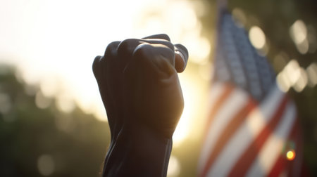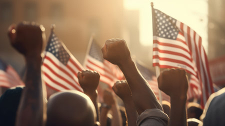 A diverse group of protesters passionately holds up their fists in solidarity, proudly waving American flags in the background, advocating for social justice and equality for all.