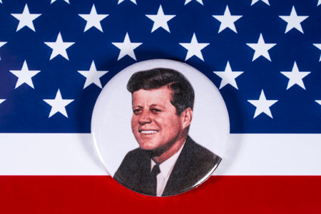 LONDON, UK - APRIL 27TH 2018: A John F. Kennedy badge pictured over the USA Flag, on 27th April 2018. John F Kennedy was the 35th President of the United States of America.