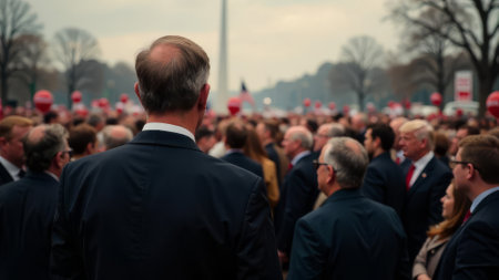 Political event with crowd of formally dressed individuals engaging in discussions. The setting is urban, with leafless trees and a cloudy sky in the background