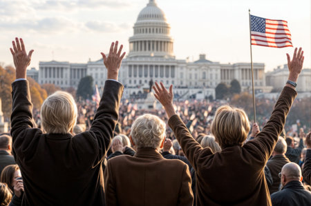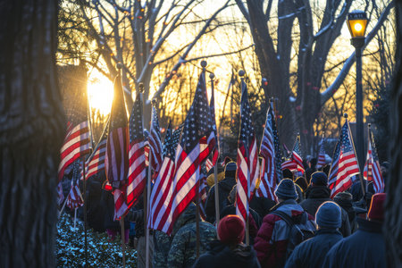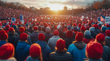 Group of People Watching a Presidential Inauguration on a Screen Outdoors with American Flags. Concept of Political Events, Patriotism, Community Gatherings in Public Spaces, Winter Clothing.