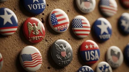 A collection of patriotic voting buttons featuring american flags liberty slogans and usa symbols on cork board.