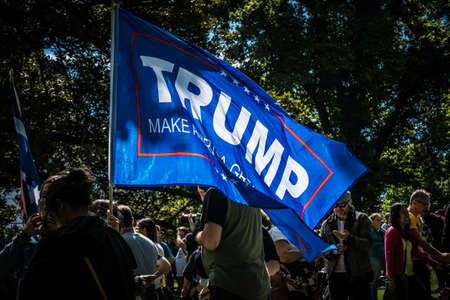 A large crowd gathers in a vibrant park during autumn, facing a backdrop displaying the American flag as they participate in a rally.