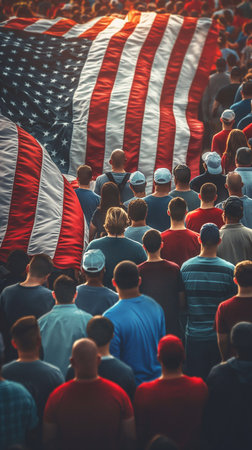 A man holds an American flag raised above his head in a crowd of people. independence day. rear view. Generative AI