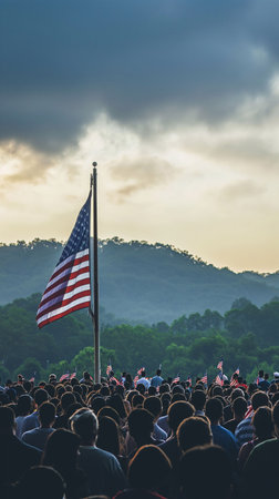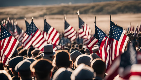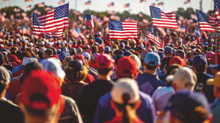 crowd of people waving multiple American flags in a patriotic gathering. Sunlight filters through, enhancing the sense of national pride. Perfect for themes on unity, patriotism, and American spirit.