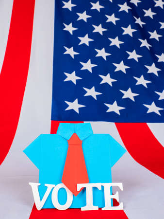 Presidential elections in America. Us flag, origami man and the word vote. Election campaign in the United States. Election of the President of the United States.