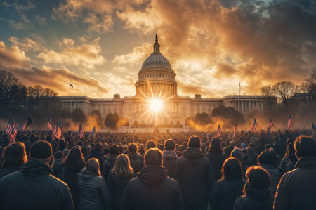 Crowds gather at dawn in front of the grand building for the inauguration, as the sun rises, casting a warm glow over the scene filled with anticipation and excitement.