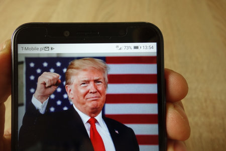 KONSKIE, POLAND - May 18, 2019: hand holding smartphone with photo of Donald Trump with American flag displayed on screen