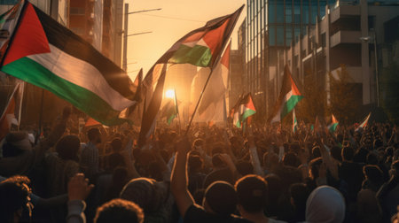Protesters stand united with raised fists and American flags during a demonstration advocating for social justice and human rights in the United States, showcasing solidarity and determination.