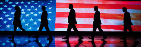 Silhouettess of business people are walking against large American flag. Concept of elections in USA