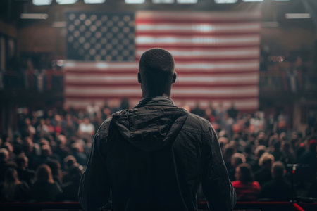A silhouette of a person standing before a large American flag, overlooking a crowd at an event