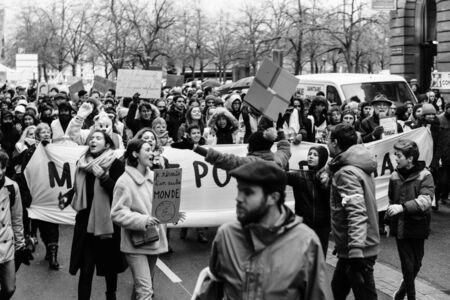 STRASBOURG, FRANCE - DEC 8, 2018: Crowd marching in Central Strasbourg at the nationwide protest Marche Pour Le Climat - black and white