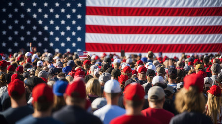 A diverse crowd wears red hats and stands united in front of a massive American flag, embodying patriotism and community spirit.