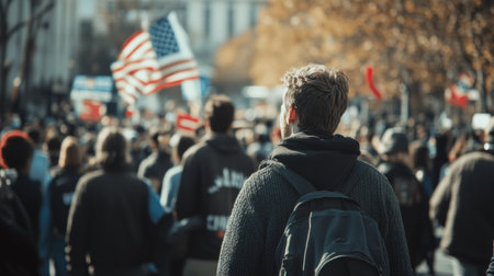 Crowd of Americans with flags at rallies in downtown Washington.