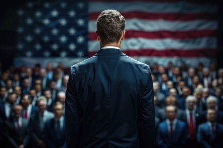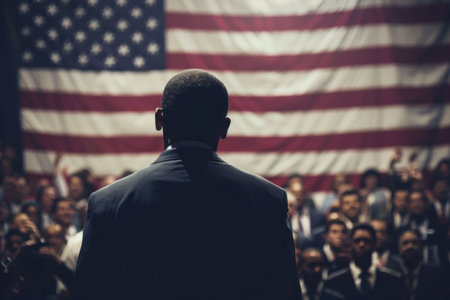 Election candidate speaking passionately to an engaged audience, with the stars and stripes prominently displayed in the background