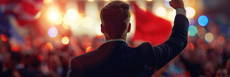 A leader stands confidently before a sea of supporters, waving flags passionately, as the crowd gathers to share a powerful political moment at dusk.