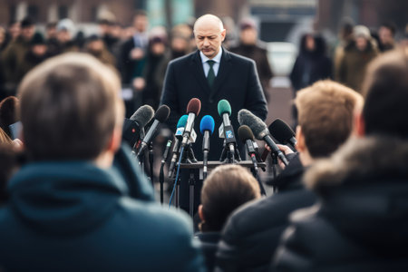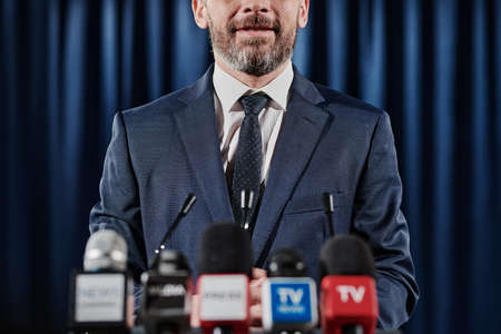 Close-up of bearded speaker in formal suit speaking for television at press conference