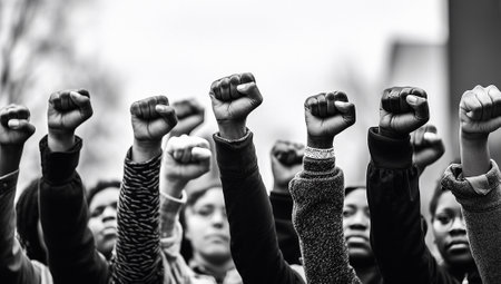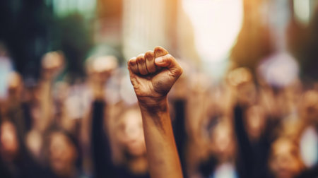 Group of protesters with their fists raised up in the air. Activists protesting on the street. People publicly demonstrating opposition. Gloomy city scenery. Generative AI.