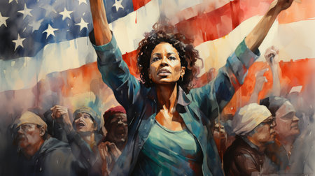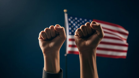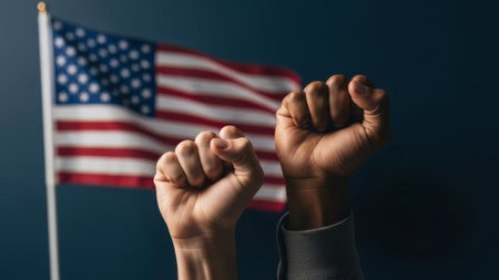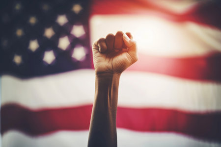 Two fists raised in protest with US flag